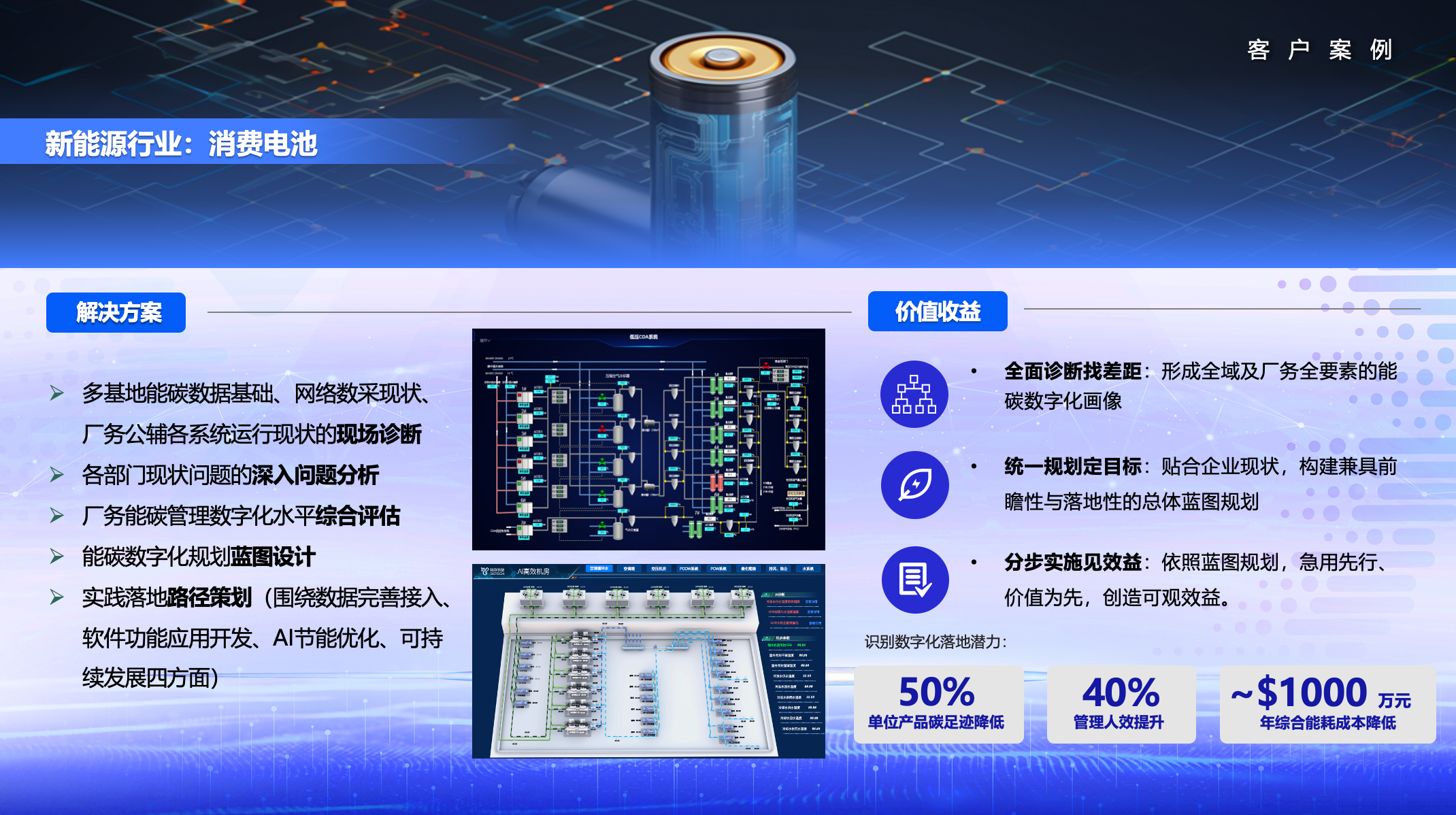 In serving a globally leading consumer battery manufacturer, GETECH achieved rapid access and efficient integration of tens of thousands of energy and carbon points across multiple sites through a multi-protocol adaptation engine and lakehouse architecture, building a solid and unified energy and carbon data foundation for the enterprise. This helped the client reduce annual comprehensive energy consumption costs by approximately 10 million yuan, improve management efficiency by 40%, and lower the carbon footprint per unit product by 50%, enabling data intelligence throughout the entire energy and carbon management process.