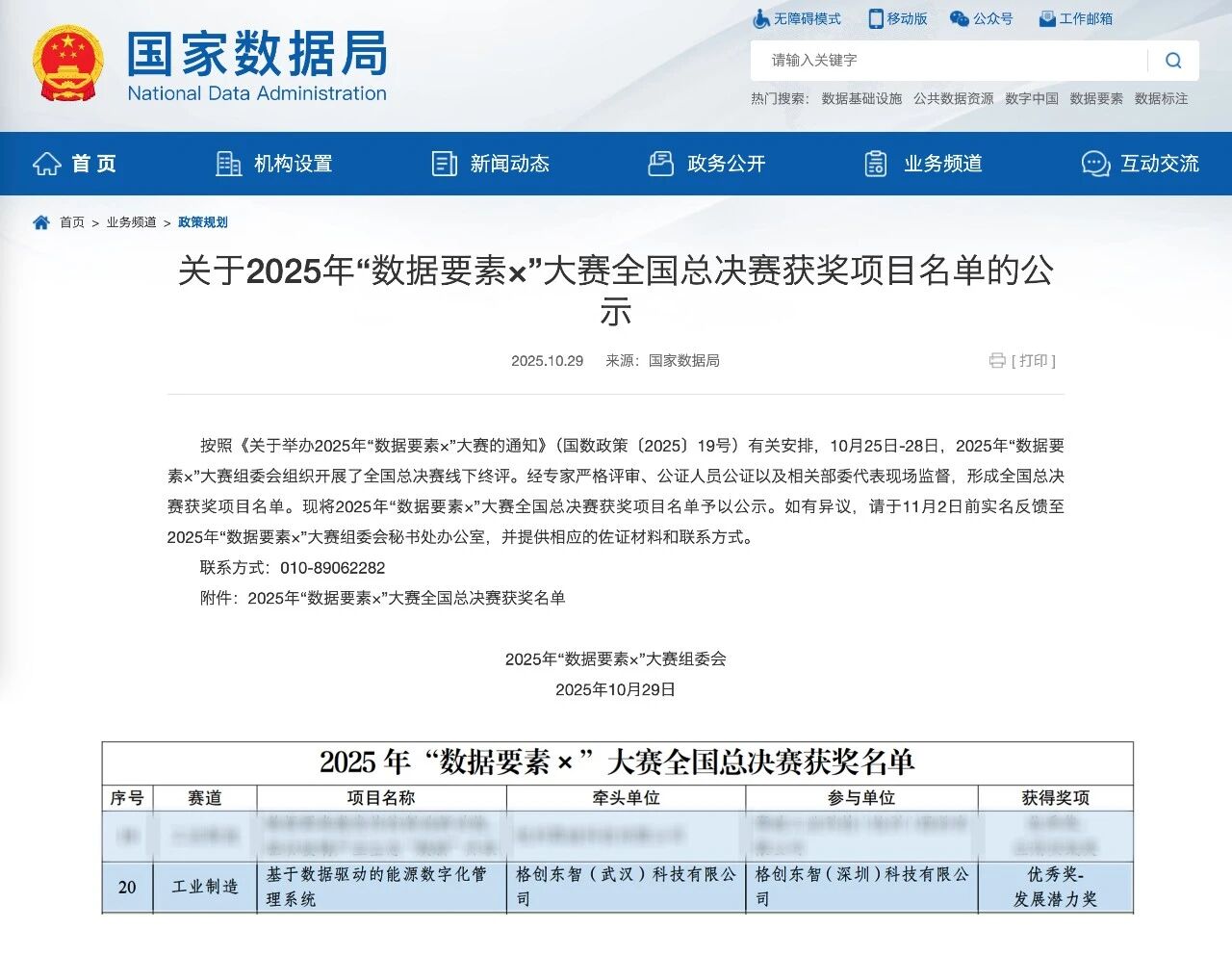 On November 2, 2025, the publicity period for the winners of the 'Data Elements ×' National Finals ended. GETECH stood out in the industrial manufacturing track with its 'Data-Driven Energy Digital Management System' project (referred to as the Energy Carbon Brain Platform), and won the 'Development Potential Award'.
