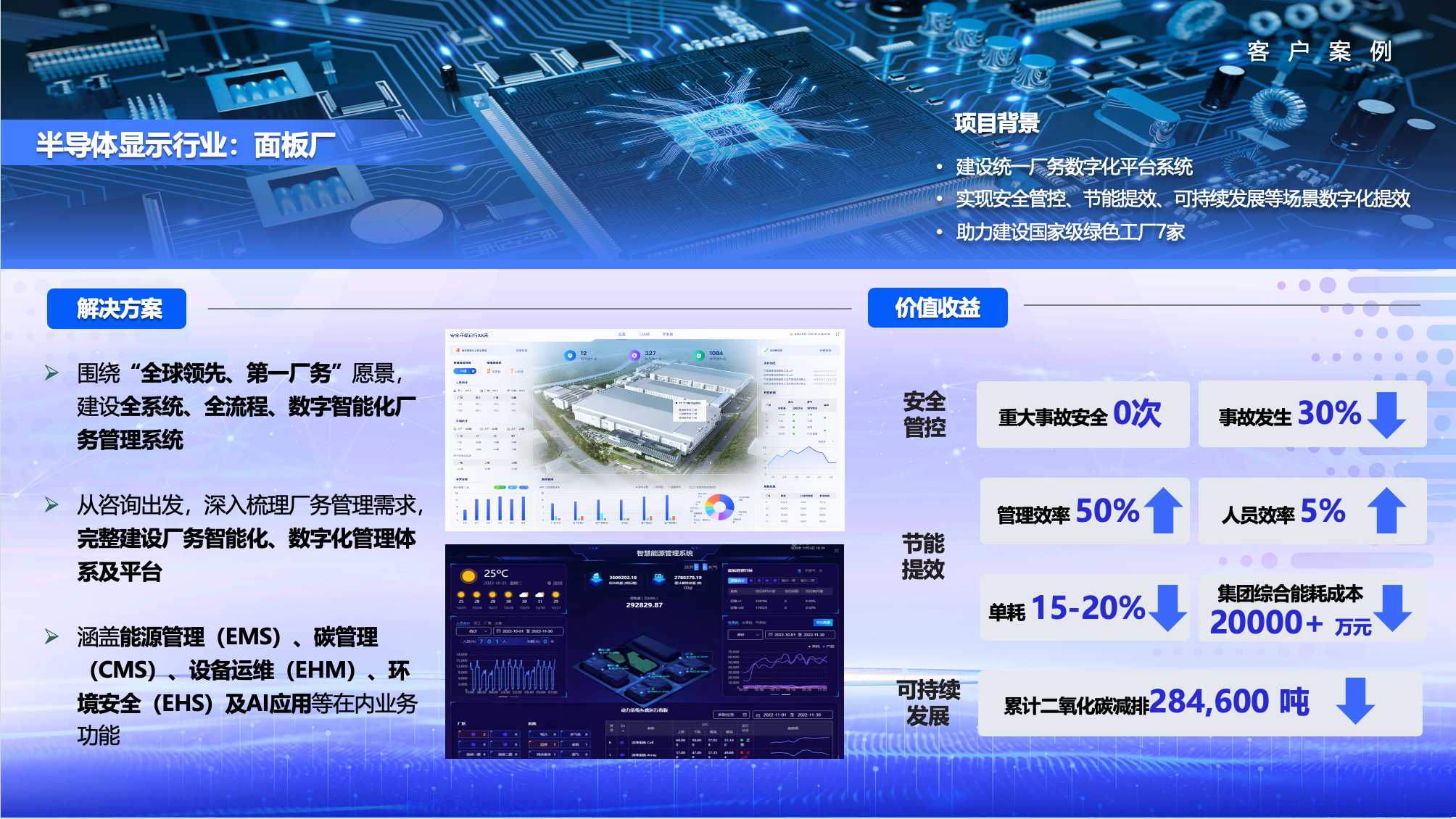In serving a leading semiconductor display company, GETECH built a comprehensive, full-process, digital intelligent plant management system, helping it establish 7 national-level green factories. This assisted the client in reducing annual comprehensive energy consumption costs by approximately 200 million yuan, improving management efficiency by 50%, and achieving a win-win in economic and environmental benefits.