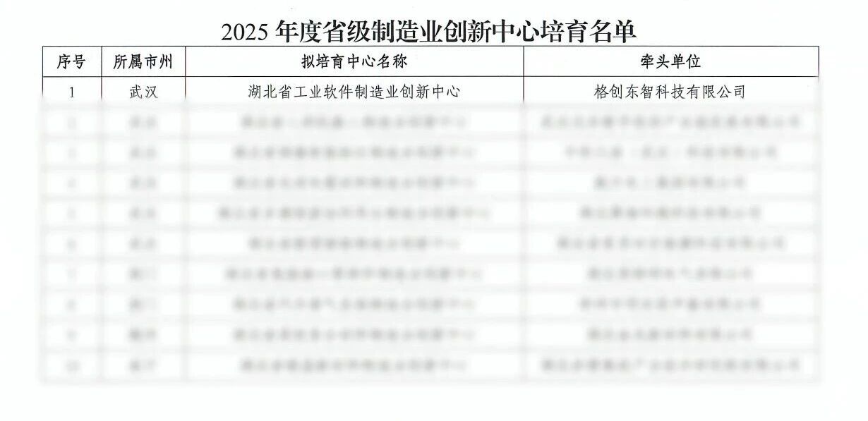 Recently, the Hubei Provincial Department of Economy and Information Technology officially announced the list of provincial manufacturing innovation centers for cultivation in 2025. GETECH successfully obtained approval to undertake the construction task of the 'Hubei Provincial Industrial Software Manufacturing Innovation Center,' becoming the only enterprise selected in this field in the province. This not only marks the official endorsement of GETECH's leading position in intelligent manufacturing industrial software and industrial artificial intelligence but also demonstrates Hubei Province's firm determination to drive manufacturing upgrades through innovation.