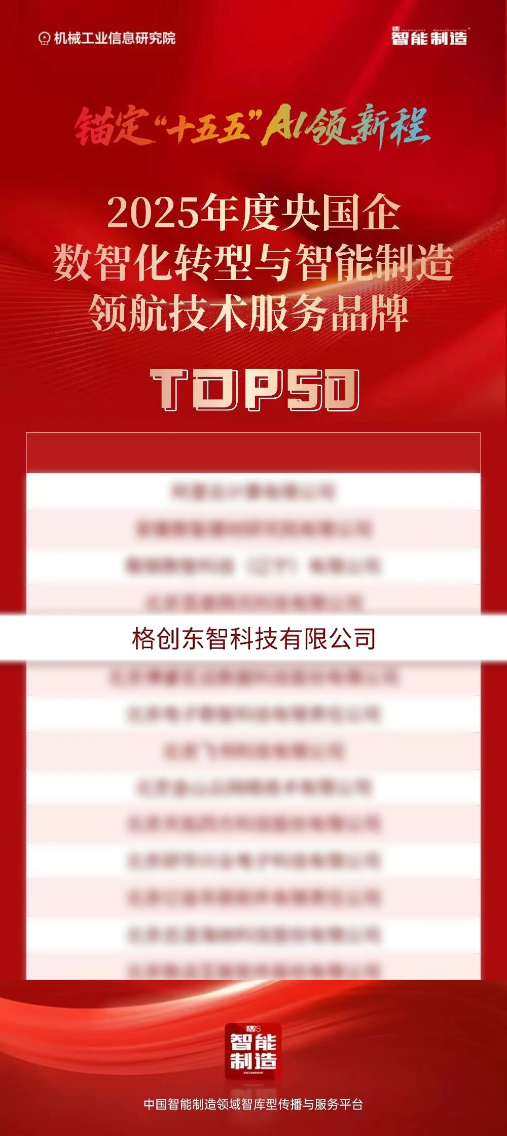 12月18日,由机械工业信息研究院《智能制造》杂志发起的2025年度央国企数智化转型与智能制造领航技术服务品牌TOP50正式揭晓。格创东智与西门子中国、中控技术、研华科技、深信服等一批国内外头部科技企业共同入选,彰显公司在赋能大国重器智能化升级中的核心价值。